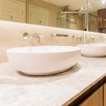We crafted a custom marble sink countertop as the main feature, paired with new wooden-tone cabinetry to bring warmth and balance to the clean white palette.